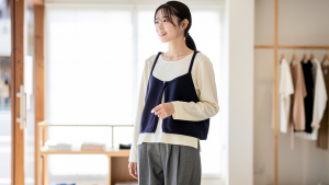 この製品に使用したcamifine(カミファイン)というペーパーヤーンは、和紙の原料であるコウゾ・ミツマタなどをポリエステルと混紡することで麻のような清涼感のあるタッチを実現し、マシンウォッシャブル、アンチピリング(毛玉防止)、吸湿速乾性、防しわ性などの機能性も抜群です。