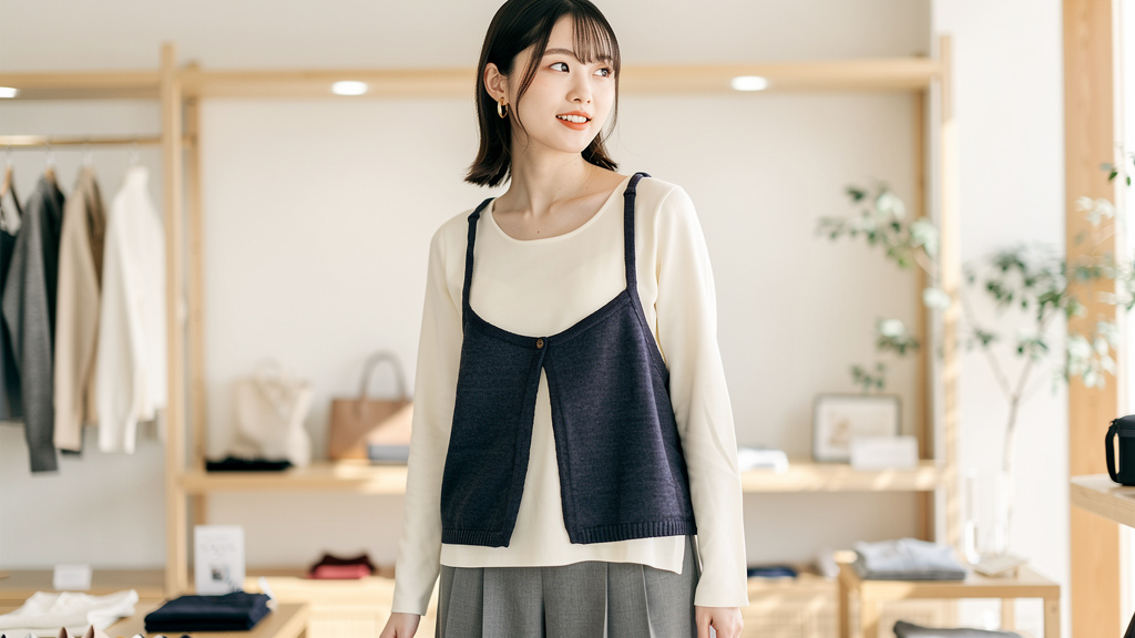 軽やかなニットキャミを重ねることで、シンプルな中にも女性らしいニュアンスが生まれます。
