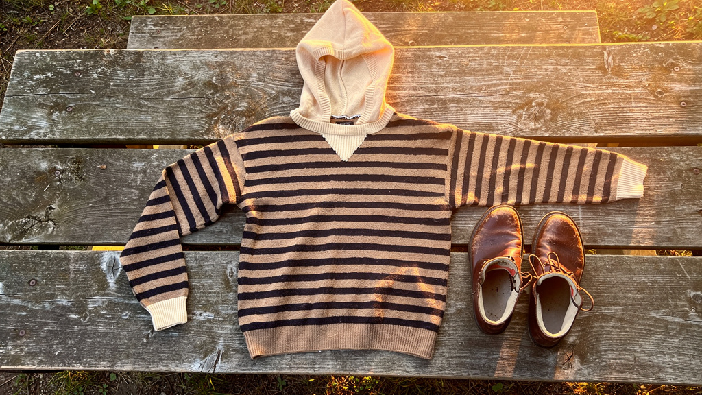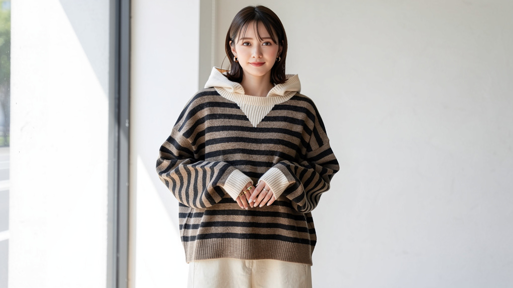 Tricolor Combination Knit Hoodie -トライカラー・コンビニットフーディ- **「トライカラー・コンビニットフーディー」**は、ボーダーニットの軽やかさと、他色のカラーでフードを組み合わせ、日常にさりげない個性を添える一着です。クラシックな落ち着... -
